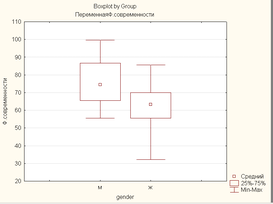 Из диаграммы (рис. П.4.3) видно, что фактор характеризующий современность у юношей проявляется сильней, чем у девушек, поскольку размахи значений и медианные значения по выборке юношей значительно выше, чем по выборке девушек.