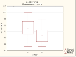 Из диаграммы (рис. П.4.2) видно, что фактор социального статуса у юношей проявляется сильней, чем у девушек, поскольку размахи значений и медианные значения по выборке юношей значительно выше ,чем по выборке девушек.