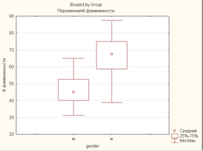 Из диаграммы (рис. П.4.4) видно, что проявление феминниных характеристик у юношей проявляется слабее, чем у девушек, поскольку размахи значений и медианные значения по выборке юношей значительно ниже, чем по выборке девушек.
