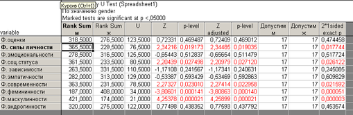 Как видно из таблицы результатов, различие между выборками юношей и девушек гендерных стереотипов в этом исследовании высокозначимо, поскольку значение Критерия Манна-Уитни по факторам где (p<0,05):