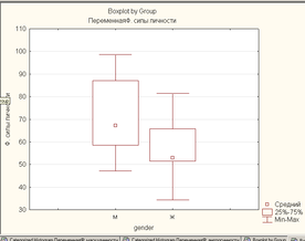 Из диаграммы (рис. П.4.1) видно, что фактор силы личности у юношей проявляется сильней, чем у девушек, поскольку размахи значений и медианные значения по выборке юношей значительно выше, чем по выборке девушек.