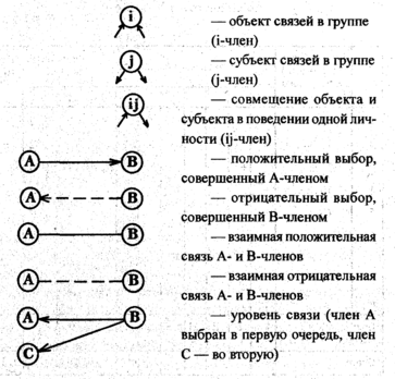 Социограмма - схематическое изображение реакции испытуемых друг на друга при ответах на социометрический критерий. Социограмма позволяет произвести сравнительный анализ структуры взаимоотношений в группе в пространстве на некоторой плоскости ("щите") с помощью специальных знаков (См. Рисунок ).