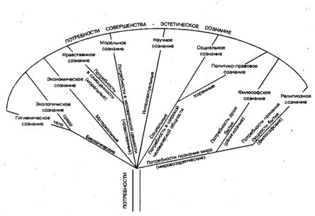 Когда речь идет о «духовных областях», или формах общественного сознания, в первую очередь выделяются те из них, за которыми, пусть и неосознанно, стоят духовные потребности. Поэтому дискуссионным оставался вопрос об экономической форме сознания, покоящейся на материальных потребностях. Однако если идти до конца, то следует констатировать и наличие двух форм сознания на основе биологических потребностей: первая обращена к телу, вторая - к внешней среде; это соответственно гигиеническая и экологическая формы сознания.