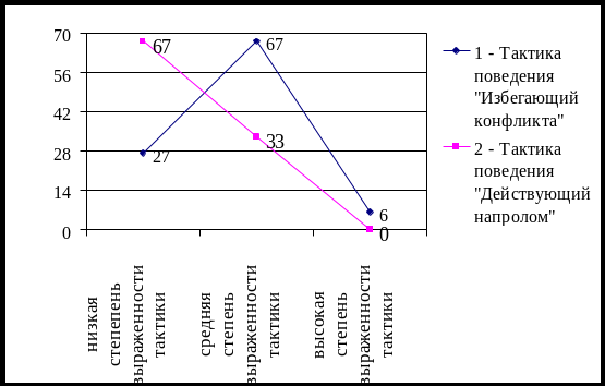 Количество баллов дает представление о выраженности тенденции к конфликтности. Обработка полученных данных представлена нами в табл. 2, которая показывает соотношение количества человек со степенью выраженности конкретной тактики в процентном отношении.