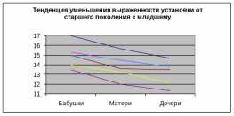 Таким образом, данные установки передаются из поколения в поколение и это статистически подтверждено. Поскольку при сравнении с нормативными показателями практически все эти материнские установки имеют средний уровень выраженности (кроме товарищеских отношений), мы можем говорить о том, что матери воспроизводят их в своих отношениях с детьми. В ходе нашего исследования были выявлена тенденция уменьшения выраженности некоторых установок от старшего поколения к младшему. К ним относятся: