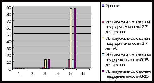 Как видно из Таблицы 3, педагоги с малым стажем педагогической деятельности имеют: высокий уровень – 1 чел., что составляет 6,7%; средний уровень – 8 чел., что составляет 53,3 %; низкий уровень – 6 чел., что составляет 40 %; педагоги с большим стажем педагогической деятельности имеют: высокий уровень – 1 чел., что составляет 6,7%; средний уровень – 8 чел., что составляет 53,3 %; низкий уровень – 6 чел., что составляет 40 %.