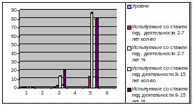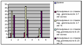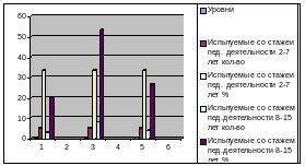 Как видно из Таблицы 11, педагоги с малым стажем педагогической деятельности имеют: высокий уровень – 4 чел., что составляет 26,7%; средний уровень – 5 чел., что составляет 33,3%; низкий уровень – 6 чел., что составляет 40%; педагоги с большим стажем педагогической деятельности имеют: высокий уровень – 2 чел., что составляет 13,3%; средний уровень – 4 чел., что составляет 26,7%; низкий уровень – 9 чел., что составляет 60%.