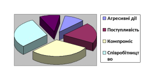 За отриманими результатами дослідження дітей дошкільного віку щодо поведінкового стилю у конфліктних ситуаціях, ми отримали наступні дані: 1 дитина проявляє у зазначеній ситуації агресивні дії, 2 дитини схильні до поступливості, на компроміс йдуть 3 дитини з нашої вибірки, 3 дитини шукають у конфліктній ситуації шляхи до співробітництва, і 1дитина воліє обрати позицію «уникання». Отримані дані зображаємо у вигляді діаграми наступним чином: