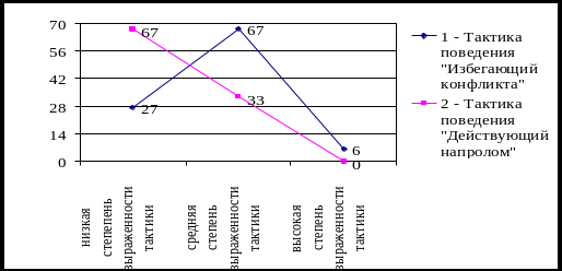 Количество баллов дает представление о выраженности тенденции к конфликтности. Обработка полученных данных представлена нами в табл. 2, которая показывает соотношение количества человек со степенью выраженности конкретной тактики в процентном отношении.