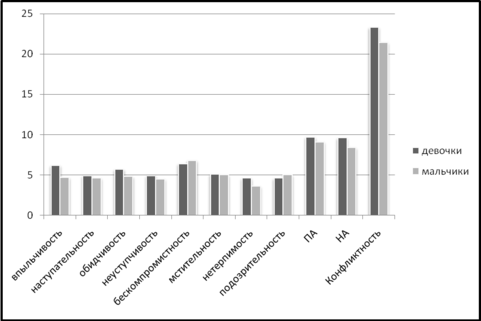 Проанализировав результаты, обнаружена тенденция – по всем шкалам девочки набрали больше баллов, чем мальчики, что свидетельствует о большей склонности к внешнему проявлению конфликта.