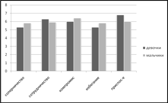По результатам исследования, обнаружена тенденция, в доминировании таких типов поведения в конфликтной ситуации у девочек как: приспособление (принесение в жертву собственных интересов ради другого) и сотрудничество (когда участники ситуации приходят к альтернативе, полностью удовлетворяющей интересы обеих сторон), а у мальчиков - компромисс, (рис. 2). Т.е. при наличии конфликта, как мальчики, так и девочки стараются максимально помочь друг другу в разрешении споров, очень аккуратно обходя «острые углы» препятствуя тем самым обострению конфликта.