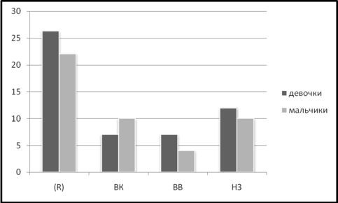 Полученные результаты, свидетельствуют о преобладании низкого показателя (R) 26,3 у девочек, это говорит о том, что желания в основном удовлетворены, именно поэтому, показатель ВК (внутренний конфликт) у девочек меньше чем у мальчиков, а показатель ВВ (внутренний вакуум) больше. Т.е. при отсутствии внутреннего конфликта у девочек наблюдается внутренняя опустошенность, снижения побуждений.