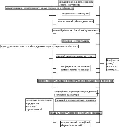 На основі кореляційного, кластерного і факторного аналізу був виділений комплекс показників, які мають найбільш значущий вплив на рівень схильності до конфліктів дітей молодшого шкільного віку. Результати дослідження свідчать, що на формування й закріплення конфліктних форм реагування молодших школярів суттєво впливають специфічні властивості. Це характеристики спрямованості і самосвідомості особистості, а також індивідуально-психологічні передумови функціонування особистості та соціально-психологічні передумови реалізації cпрямованості особистості молодших школярів, схильних до конфліктної поведінки. Зазначені показники були включені до психологічного симптомокомплексу, котрий являє собою сукупність індивідуально-особистісних та соціально-психологічних характеристик дітей даної вікової групи, що є детермінантами їх конфліктогенних проявів (рис.1).
