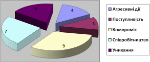 Узагальнюючи дані про поведінковий стиль у конфліктній ситуації молодших школярів, то можемо зазначити, що учні, які виявили високий рівень агресивності (8 учнів), та які мають домінування якостей холеричного типу темпераменту (5 учнів) проявляють агресивність і у конфліктних ситуаціях (4 учня). Молодші школярі, які виявили низький рівень проявів агресивної поведінки (8 учнів), притаманний поведінковий стиль у конфліктних ситуаціях – «уникання» (3 учня), поступливість (2 учня), співробітництво (2 учня), компроміс (1 учень). Серед учнів 2-го класу які мають середній рівень агресивних проявів у поведінці (12 учнів), переважає компромісний стиль у конфліктних ситуаціях (5 учнів), також їм притаманний поведінковий стиль «співробітництво» (3 учня), «уникання (3 учня) та поступливість (1 учень).
