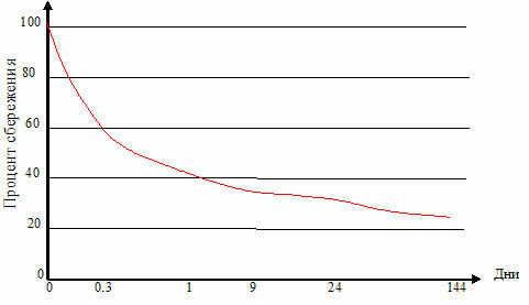 Рис. 1. Процент сбереженного материала при повторном заучивании, по Эббингаузу, 1912