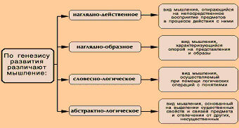 Наглядно-действенное, наглядно-образное, словесно-логическое и абстрактно-логическое мышление являются последовательными этапами развития мышления в филогенезе и в онтогенезе [10, c.120 - 122].