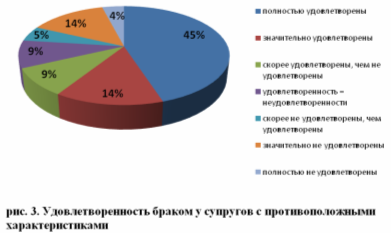 К опрошенным нами семьям, в которых наблюдается сходство личностных свойств супругов, относятся: 6, 7 и 16, в которых у супругов полностью совпадает тип отношения к окружающим. В паре 16 оба супруга практически полностью удовлетворены браком, а в парах 6 и 7 мужчина удовлетворен браком значительно, а женщина – полностью.