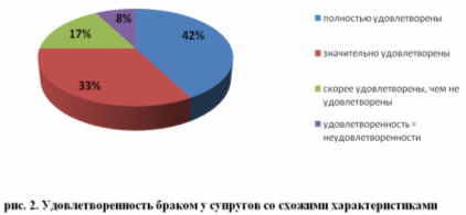 Таким образом, условно разделив супружеские пары на две группы, мы получаем следующую статистику: в данной группе 42% полностью удовлетворены браком, 33 % значительно удовлетворены, 17% скорее удовлетворены, чем не удовлетворены, у 8% удовлетворенность = неудовлетворенности. Данные наглядно представлены на диаграмме (рисунок 2).