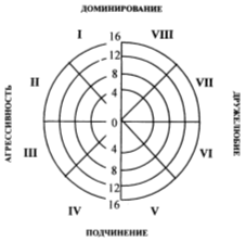 В результате производится подсчет баллов по каждой октанте с помощью специального "ключа" к опроснику. Полученные баллы переносятся на дискограмму (рис. 1), при этом расстояние от центра круга соответствует числу баллов по данной октанте (от 0 до 16). Концы векторов соединяются и образуют личностный профиль. [18]