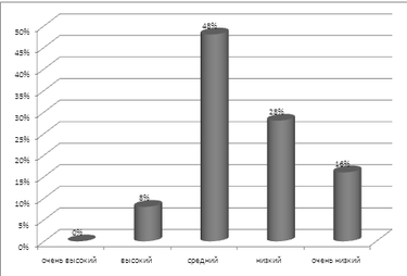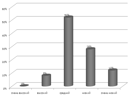 Таким образом, 48 % учащихся 5 класса имеют средний уровень распределения внимания, 8 % учащихся – высокий уровень, очень высокий уровень - 0% детей, низкий уровень распределения внимания отмечается у 28% детей и у 16 % детей - очень низкий уровень распределения внимания.