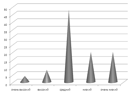 В результате определения уровня избирательность внимания, а также помехоустойчивость внимания нами были получены следующие результаты: в группе один ребенок имеет очень высокий уровень продуктивности им устойчивости внимания, двое детей имеют высокий уровень продуктивности и устойчивости внимания, 12 детей – средний уровень, 5 детей – низкий уровень и 5 детей – очень низкий уровень продуктивности и устойчивости внимания (см. рис. 5).
