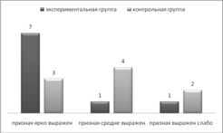 Опираясь на эту диаграмму, можно сказать, что дети из экспериментальной группы намного общительнее, чем в контрольной (7 и 3 человека соответственно). Несколько закрыты и отгорожены 2 ребенка из контрольной группы и только 1 из экспериментальной. Средние показатели по данному признаку чаще наблюдаются у детей контрольной группы (4 человека).