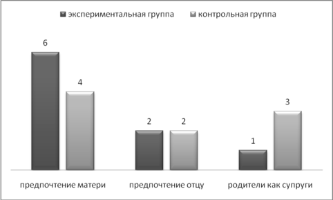 Отношение к матери определяется частотой предпочтения. В экспериментальной группе 6 детей упоминают чаще мать, чем отца (в контрольной только 4 человека). Одинаковое число детей эмоционально близко воспринимают отца. Однако своих родителей как супружескую чету дети педагогов рассматривают реже (один ребенок), а дети непедагогов чаще (трое).