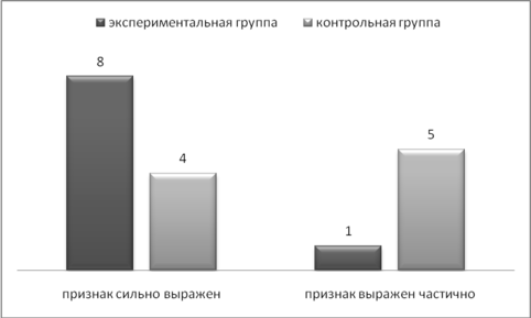 Отношение к авторитетному взрослому намного сильнее выражено у детей учителей (8 человек в экспериментальной и 4 в контрольной группе). У детей, профессия родителей которых не связана с преподаванием, данный признак выражен частично (5 человек в контрольной группе).