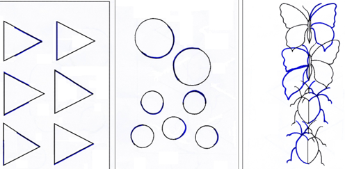 Каждому ребенку выдавались таблицы, на которых изображены геометрические фигуры (треугольники, круги – рис. 1.а, 1.б) с неполными контурами, и незаконченные контуры двух предметных изображений (бабочки и жука – рис. 1.в) и было дано задание дорисовать эти предметы.