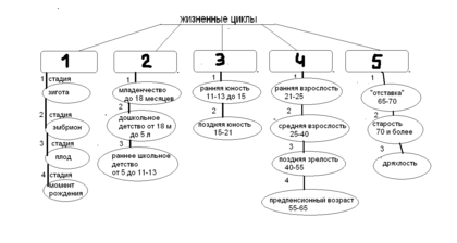 Для понимания жизненного цикла человека необходимы определения последовательной смены состояния развития, однонаправленности и развитии времени жизни, то есть топологическая характеристика этого времени. Вместе с тем следует учитывать длительность существования индивида, определяемую общей продолжительностью жизни всех индивидов данного вида, - метрическую характеристику жизненного цикла и его отдельных моментов. Специальных классификаций возрастов существует множество и в антропологии, и в педиатрии, и в психофизиологии.