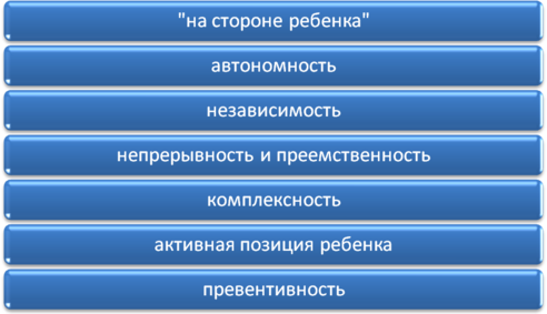 "на стороне ребенка": во главе угла ставятся интересы ребенка, обеспечивается защита его прав при учете позиций других участников учебно-воспитательного процесса;