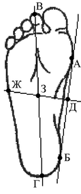 Вимірювальний метод (плантографічний). На папері робили відбиток стопи дитини за допомогою легкої фарби, що змивалася (рис. 2.1.). На цьому відбитку проводили лінії АБ – крайні точки внутрішньої сторони, ВГ – через середину 2-го пальця і середину п'яти. ДЖ – через середину подовжньої осі ВГ і під кутом 90° до АБ. Крапку З ставили на місці перетину лінії ДЖ з внутрішнім краєм відбитку стопи.