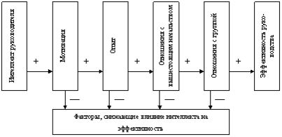 Схематически возможная цепочка связи «интеллект руководителя – эффективность руководства», включая промежуточные переменные, отображена на нижеприведенной схеме. Вот один из реальных вариантов интерпретации содержания этого рисунка: недостаточная мотивация и опыт руководителя, слабая поддержка его со стороны подчиненных (группы) и напряженные отношения с вышестоящим начальником имеют своим следствием снижение влияния интеллекта руководителя на эффективность его деятельности.