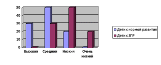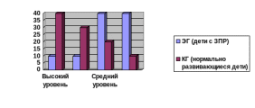 | Уровни | Экспериментальная группа (дети с ЗПР) | Контрольная группа (нормально развивающиеся дети) | ||