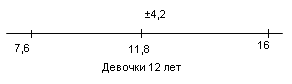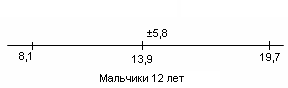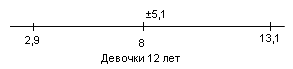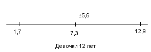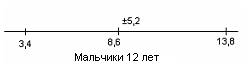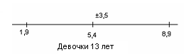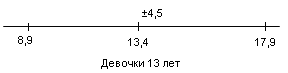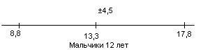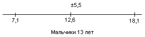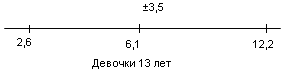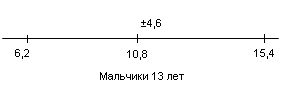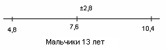 У испытуемых девочек в возрасте 13 лет М = 6,1, σ = 3,5(рис.9); у мальчиков 13 лет М = 10,8, σ = 4,6 (рис.10).