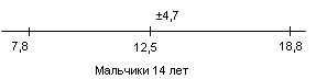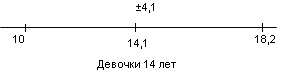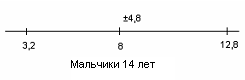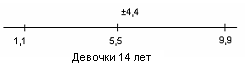 У испытуемых девочек в возрасте 14 лет М = 5,5, σ = 4,4(рис.17); у мальчиков 14 лет М = 8, σ = 4,8(рис.18).