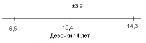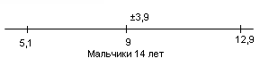 У испытуемых девочек в возрасте 14 лет М = 10,4, σ = 3,9(рис.11); у мальчиков 14 лет М = 9, σ = 3,9 (рис.12).