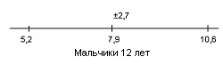 У испытуемых девочек в возрасте 13 лет М = 5,4, σ = 3,5(рис.15); у мальчиков 13лет М = 7,6, σ = 2,8(рис.16).