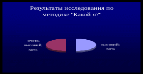 Проведя исследование по данной методике, мы получили следующие результаты. У пятерых детей (Соня Л., Лера М., Леша Л., Рома Л.) очень высокий уровень самооценки. Все перечисленные выше набрали по 10 баллов, у пятерых – высокий уровень самооценки, причем, двое (Алиса Ю. и Костя К.) набрали по 8,5 баллов каждый, трое (Денис Х., Саша П., Стася И.) набрали по 9,5 баллов каждый. (подробнее см. Приложение № 2). В процентном соотношении это выглядит следующим образом. (см. рис. 1)