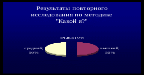 2. При повторном проведении методики «Какой я?» мы получили следующие результаты. Очень высокого уровня не оказалось ни у одного ребенка. Высокий уровень самооценки присутствует у 5 детей, причем, если при проведении констатирующего эксперимента сумма баллов колебалась от 8,5 до 9,5, то при вторичном исследовании она составила 8 – 8,5 баллов. На среднем уровне оказалось 5 детей, где сумма набранных баллов 7 – 7,5. (см. Приложение № 6). В процентном соотношении это выглядит следующим образом. (см. рис. 3)
