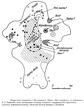 «Во всех жертвенных местах найдены кости животных. Вероятно, их убивали и разрубали на части тут же, так как в заполнении ям при анализах отмечается присутствие органических веществ, как считают исследователи, мяса и крови. Преобладают кости домашних животных, реже оленя, медведя, волка, собаки. Волк и собака по ирландским сагам принадлежали миру богов и в грядущей катастрофе все должно погибнуть в борьбе с мировым волком». Излюбленным животным кельтов был кабан. Он олицетворял силы природы, белый кабан являлся символом друидов, свинина была обязательна при ритуальной еде. В сагах хороший король «без изъяна» уподоблялся «кабану, идущему перед желудями». Охота на кабана в сагах приводит в подземный мир. Двойственное значение имел конь — с одной стороны, он был солнечным символом и защитником, с другой, являлся проводником в подземный мир и предвестником смерти. Как это похоже на мифологию славян — одна история о смерти Вещего Олега чего стоит. Вещи, которые сопровождали покойника или жертву, кельты, как впрочем, и славяне, ритуально «убивали».