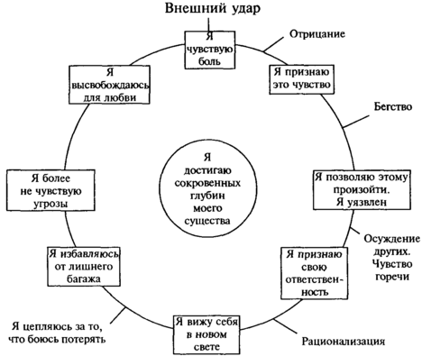 С завершением полного оборота “Колеса развития” человек становится более свободным для любви, более способным идти на уступки и более ранимым. Затем вновь происходит что-то неприятное, и колесо снова начинает вращаться — но на этот раз путешествие значительно короче. Человек двигается быстрее, и по более короткому пути. Каждое внешнее воздействие отправляет человека для совершения еще одного круга развития — однако радиус такого круга все меньше и меньше, так что я как бы двигаюсь по спирали, которая завершается в самых глубинах человеческой сущности, там, где обитает Бог, где человек уже не чувствую боли и не должен поэтому отправляться в следующее кругообращение.