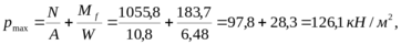 Определяем напряжение в грунте под подошвой фундамента в направлении длинной стороны а без учета веса фундамента и грунта на его уступах от расчетных нагрузок: