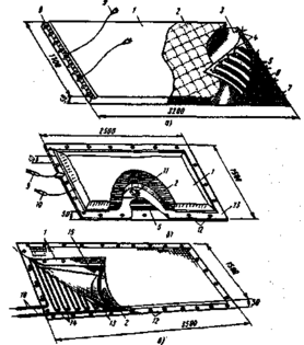 ТЕМ складається із зовнішньої захисної оболонки, теплоізоляційного шару і нагрівального елементу, що виготовляється з голого нихромового дроту діаметром 0,8 мм, укладеного «змійкою» в чохлі з скляної або азбестової тканини чи ж запресованого в термостатичну гуму. Потужність нагрівального елементу при напрузі 36 В повинна бути не менше 100 Вт на 1 м2. Розмір ТЕМа 3,2х 1,6 м; обігрів проводять при напруженн 36 - 42 В.