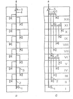 а - система з вертикальним колектором; б - система з горизонтальним колектором; 1 - отвір для видалення повітря; 2 - вертикальний колектор; З - відгалуження від колектора; 4 - витяжна вентиляційна шахта; 5 -регулюючий клапан; 6 - горизонтальний колектор