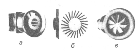 а - круглий з нерухомими лопатями; б- квадратний з поворотними лопатями; в- плафон з обертовим ротором