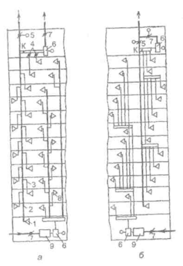 а - системи з вертикальними колекторами; б - системи з горизонтальними колекторами-збірниками; 1 - отвори на видалення повітря, 2 -вертикальний колектор; 3 - відгалуження від колектора, 4 -зворотні клапани (самозакривні); 5 - автоматичний клапан; 6 - вентилятор, / -клапан; 8 - отвори для подачі повітря; 9 - припливна камера