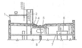 1 - машинне відділення ліфта; 2 - витяжна вентиляційна шахта; 3 - панель покриття; 4 - опорна панель; 5 - панель покриття лотка; 6 - оголовок вентиляційного блока; 7 - панель горищного перекриття; 8 - водостічний стояк