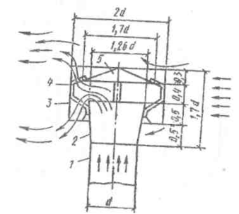 Висота теплого горища повинна бути не менше 1,6 м. Випуск повітря на тепле горище здійснюється через оголовки, які ставляться на вентиляційних блоках. Використання дефлекторів у витяжних вентиляційних системах з природним спонуканням обґрунтовується за результатами аеродинамічного розрахунку, коли втрати тиску в системі більші наявного гравітаційного тиску. Конструктивно дефлектор типу ЦАП (центральний аерогідродинамічний інститут) зображено на рисунку 8.