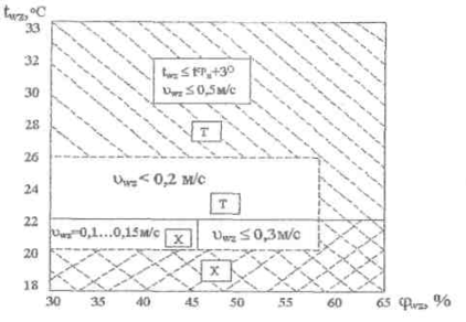 Певне співвідношення показників параметрів повітряного середовища приміщень в робочій зоні (температура tWiZ, рухомість повітря uwz, відносна вологість